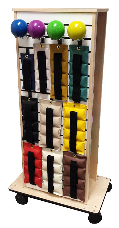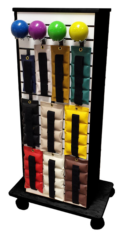 Our custom-built Stor-Edge Multi-Purpose Cart keep weights, resistance bands and other tools and equipment at hands' reach. The SR-003 Stor-Edge Multi-Purpose Cart is an open cart with slatwall hanger board on front for optional accessories, weight rack storage on back, resistance band dispensers on right side and storage compartment on left side. The cart sits on casters for ease and movability.