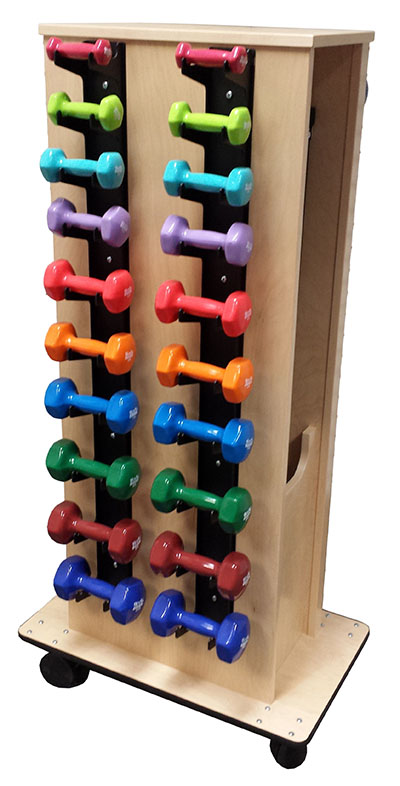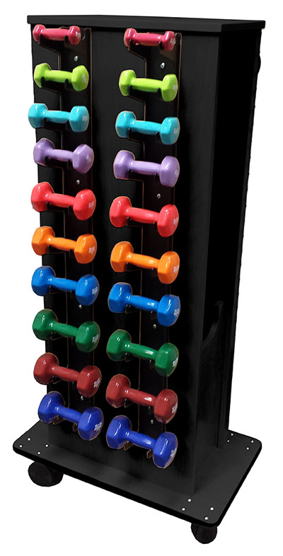 Dumbbell rack comes with a full set of?Deluxe Vinyl Dumbbell Prime. Strong, steel construction holds dumbbells horizontally on four sturdy metal shelves. Assembly required. Rack with dumbbell set: 205 lbs.