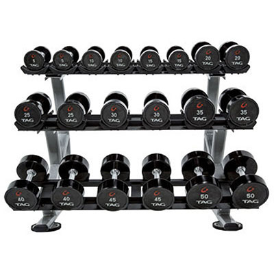 The TAG Fitness (5-50 lb) Urethane Dumbbells and Rack provides a complete strength training package for home gyms and commercial facilities. This set includes TAG Fitness Urethane Dumbbells ranging from 5 to 50 pounds, paired with the TAG Commercial Dumbbell Rack for safe, accessible storage. The design supports a wide range of training styles, making it suitable for individual workouts, group training, and professional coaching environments. Each TAG Fitness Dumbbell features a high-quality urethane coating that outperforms rubber in longevity, appearance, and odor resistance. The round dumbbell heads display easy-to-read molded weight markings, while the hardened chrome handles and comfortable knurling offer a secure, consistent grip. The three-tier rack includes molded saddles to protect each dumbbell and keep your training area organized and safe from unnecessary wear. Ideal for home gyms, studios, and commercial training facilities, this dumbbell set and rack combination maximizes floor space while delivering reliable performance for users of all experience levels. The durable construction and professional-grade design ensure long-term value in busy training environments. Note: Rack image shows silver finish.