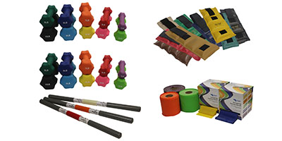 Weight Kit 3: (2) Sets of 1-10 lb Dumbbells, (1) Set of 16 Hugger Weights, (1) Set of Theraband Bands, (1) set of 1-3 lb weight Bars: