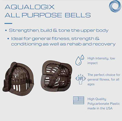 Aqualogix High Resistance Bells: Ideal for those focused on strength and power training. The Aqualogix High Resistance Bells are typically used to develop power and strength. They are often the choice amongst more experienced users who are primarily focused on strength and endurance. Also popular with users that only move at slow tempos.