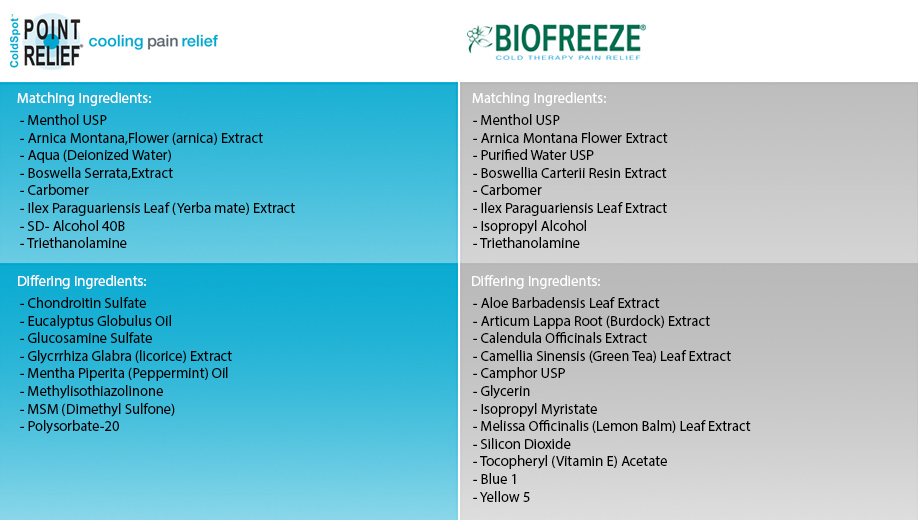 Point Relief® ColdSpot™ penetrates deep into the muscle providing fast-acting, soothing releif of minor aches and pains associated with muscle and joint soreness. ColdSpot™ is made with all-natural ingredients including menthol, MSM, ilex, and arnica. Our water-based formula minimizes grease and residue, and contains a higher menthol concentration when compared to the other leading brands.