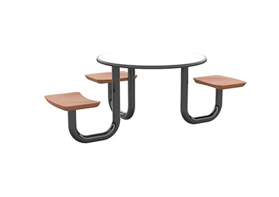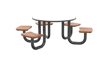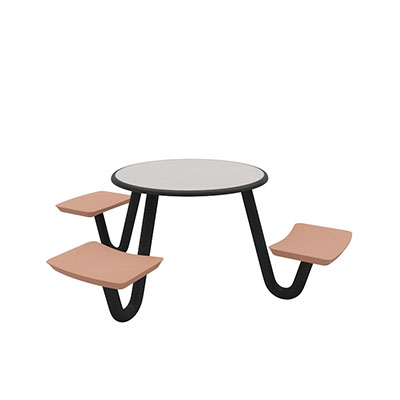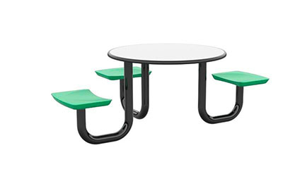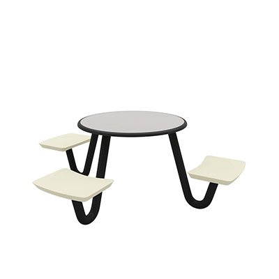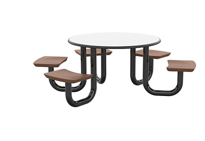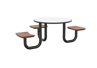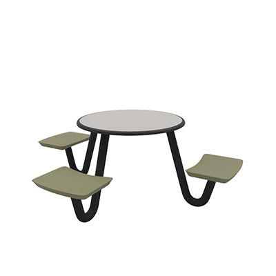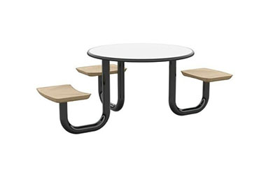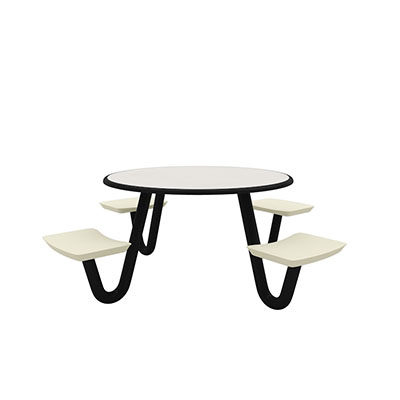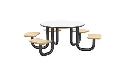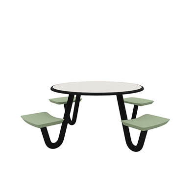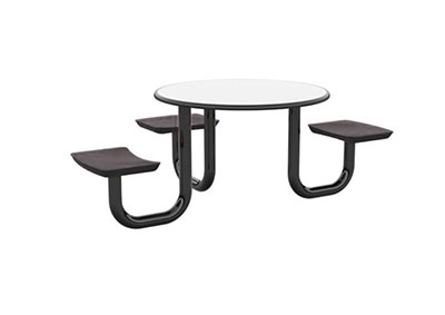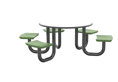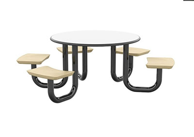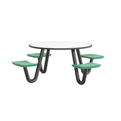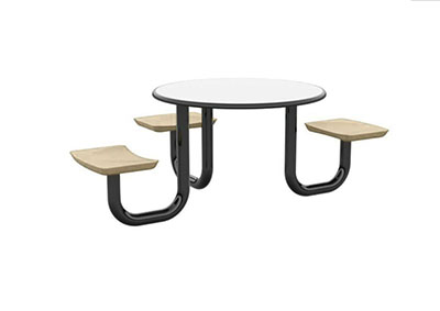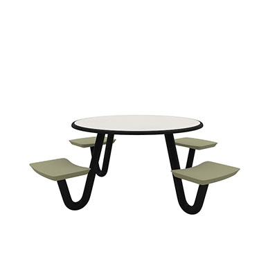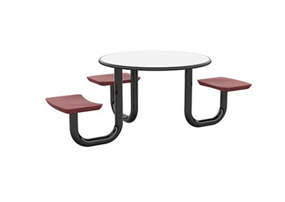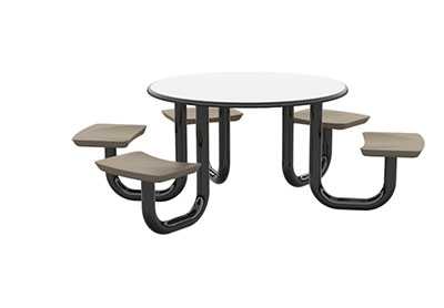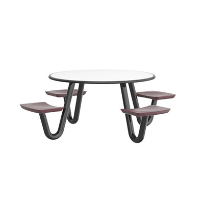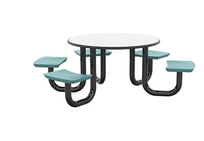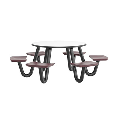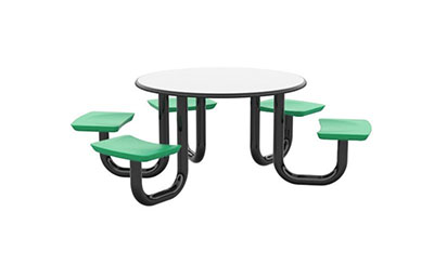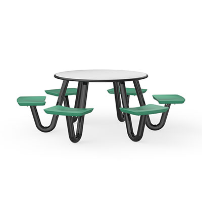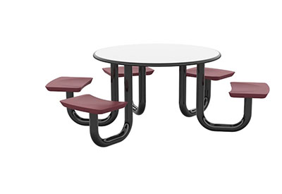 The Anchor Table is the perfect choice for any environment. Constructed of high impact "no break" polyethylene and designed with a rotationally molded design for increased strength, this durable product is perfect for any residential institution, school or university, detention center, public safety facility and more. The seat configurations range from 3 to 8 seats and are available in aqua, black, blue grey, brown, burgundy, gray, green, indigo, midnight blue, sand, slate blue and stone grey. The heavy-duty table is designed with a laminate top that is seamless one-piece design with extreme surface strength, high impact resistance, along with a rounded edge for additional safety and comfort. Attached to the legs are tamper-resistant screws for increased security and easy maintenance. The tables also feature a continuous seam welded frame structure that consists of 3" diameter 14-gauge powder coated steel with 11-gauge steel seat supports. ADA Compliant tables are manufactured with one less leg to meet building code requirements. Each table is proudly made in the USA! Floor bolting is recommended for added stability. This table is round with a 42" diameter and can seat up to 4 people.