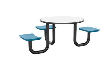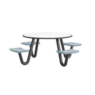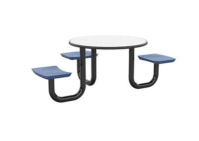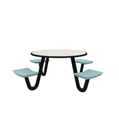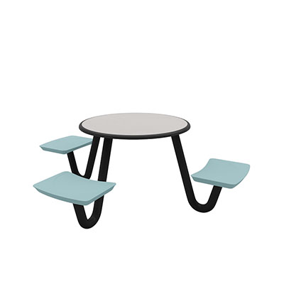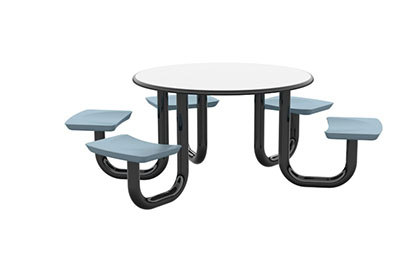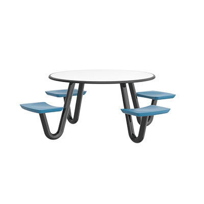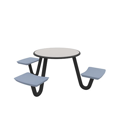 The Anchor Table is the perfect choice for any environment. Constructed of high impact "no break" polyethylene and designed with a rotationally molded design for increased strength, this durable product is perfect for any residential institution, school or university, detention center, public safety facility and more. The seat configurations range from 3 to 8 seats and are available in blue grey. The heavy-duty table is designed with a laminate top that is seamless one-piece design with extreme surface strength, high impact resistance, along with a rounded edge for additional safety and comfort. Attached to the legs are tamper-resistant screws for increased security and easy maintenance. The tables also feature a continuous seam welded frame structure that consists of 3" diameter 14-gauge powder coated steel with 11-gauge steel seat supports. ADA Compliant tables are manufactured with one less leg to meet building code requirements. Each table is proudly made in the USA! Floor bolting is recommended for added stability. This table is round with a 42" diameter and can seat up to 4 people.