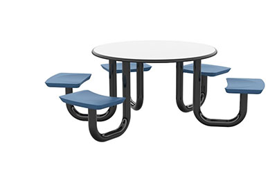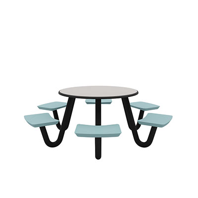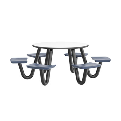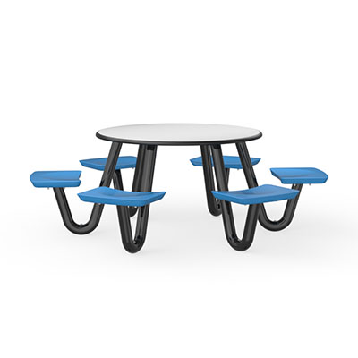 The Anchor Table is the perfect choice for any environment. Constructed of high impact "no break" polyethylene and designed with a rotationally molded design for increased strength, this durable product is perfect for any residential institution, school or university, detention center, public safety facility and more. The seat configurations range from 3 to 8 seats and are available in blue grey. The heavy-duty table is designed with a laminate top that is seamless one-piece design with extreme surface strength, high impact resistance, along with a rounded edge for additional safety and comfort. Attached to the legs are tamper-resistant screws for increased security and easy maintenance. The tables also feature a continuous seam welded frame structure that consists of 3" diameter 14-gauge powder coated steel with 11-gauge steel seat supports. ADA Compliant tables are manufactured with one less leg to meet building code requirements. Each table is proudly made in the USA! Floor bolting is recommended for added stability. This table is round with a 48" diameter and can seat up to 6 people.